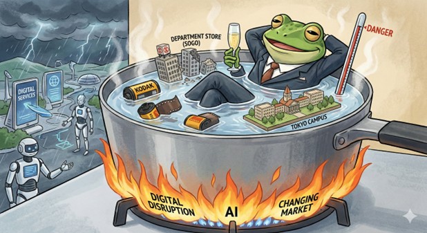「入試」「教務」「キャリア」「校友会」が分断され、学生や卒業生の情報を一気通貫で活用できていない大学の現状は、かつてのコダックの姿と酷似しています。過去の成功モデル(一定の受験生確保と在学中の教育提供)に安住し、組織間の壁を取り払って学生・卒業生のLTV(生涯顧客価値)を高める構造改革に着手できなければ、同じような末路を辿る危険性があります)